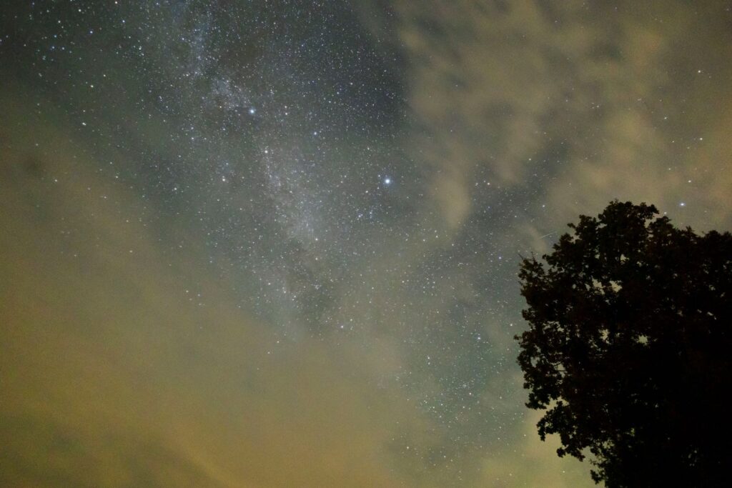Enfin, bij aankomst was het nog vreselijk warm en redelijk zonnig weer. Het betrok een beetje, hoewel je nog wel wat sterren kon zien af en toe. Alles wel opgebouwd want we doen net alsof we geboren optimisten zijn en wachten op het donker. Het kampvuur ging aan en de onderbroekenlol ook. Ik maakte een paar foto’s van de melkweg tussen de wolken door maar het werd niet goed genoeg om echt te gaan waarnemen en ik dook maar op tijd in bed.
